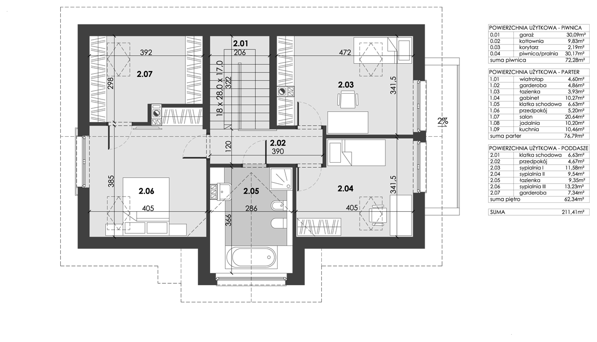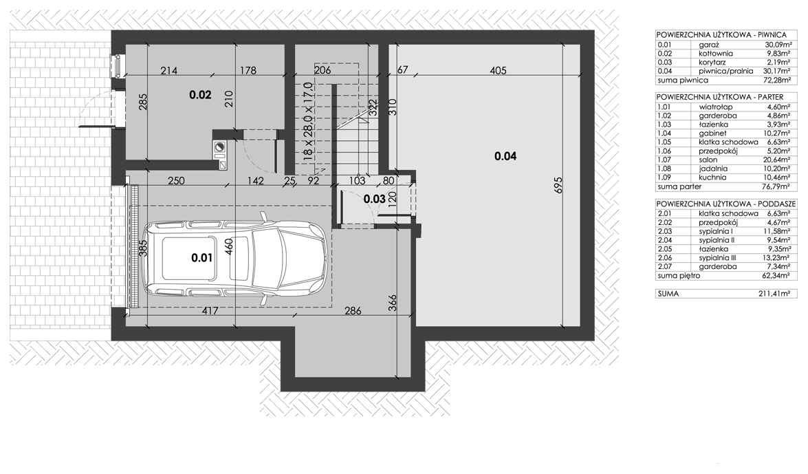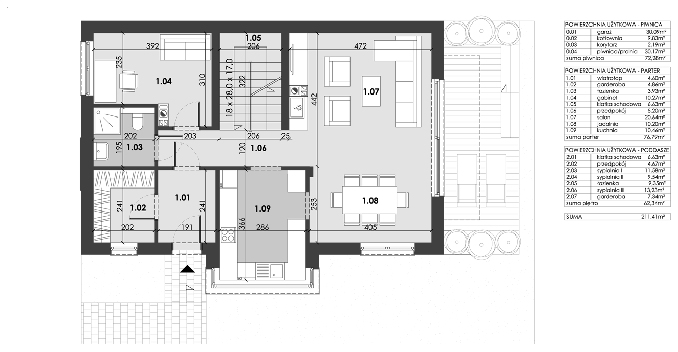 Dom Miodowy G1 P to budynek o tradycyjnej, acz nowoczesnej formie. Piwnica, parter i poddasze połączone są klatką schodową umieszczoną w centrum bryły. Kondygnacja podziemna stanowi część gospodarczą z garażem jednostanowiskowym, kotłownią dostępną zarówno z garażu, jak i z zewnątrz oraz piwnicą, która może służyć, jako pralnia. Na parterze zlokalizowano strefę dzienną z salonem, jadalnią i kuchnią umieszczoną w wyjątkowym, prostokątnym wykuszu. Na tej kondygnacji zlokalizowany jest również gabinet mogący służyć, jako pokój gościnny, łazienka oraz garderoba dostępna z wiatrołapu. Poddasze podzielono na dwie części. W jednej zaprojektowano sypialnie dziecięce z dostępem do wspólnego balkonu, a w drugiej sypialnię główną z obszerną garderobą, którą w części lub całości można zaadaptować na dodatkową łazienkę. W środku założenia, w wykuszu, umieszczono łazienkę z dużym panoramicznym oknem.