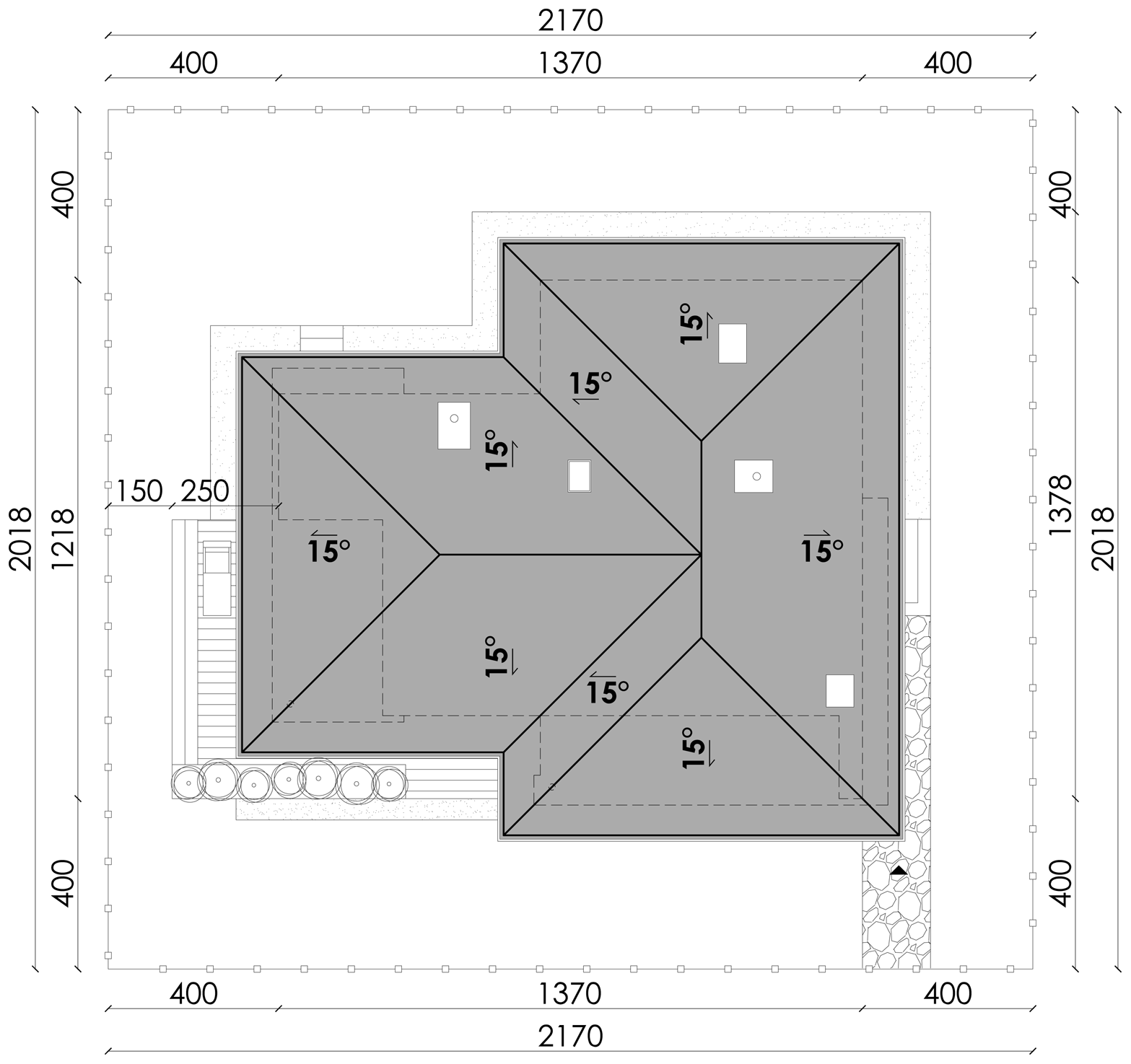 - kąt nachylenia dachu: 15 stopni